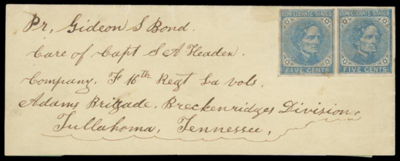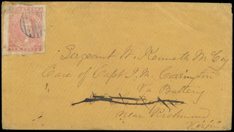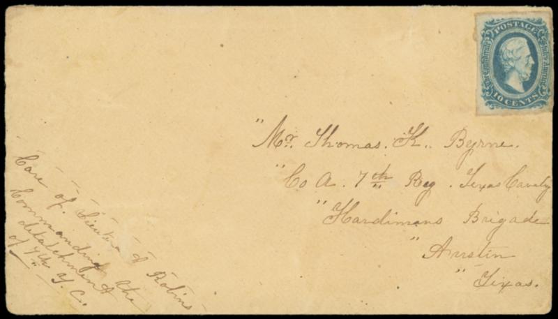 1863, 10¢ blue. Large margins, uncanceled on buff cover addressed to Mr. Thomas K. Byrne, Co. A. 7th Reg. Texas Cavalry, Hardimans Brigade, Austin, Texas, endorsed "Care of Lieutenant A. Robins, Commanding the detachment of 7th Y.C."; couple tiny edge tears, Very Fine. Scott No. 11; Estimate $75 - 100.