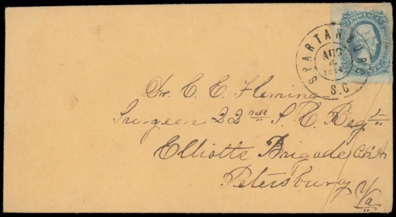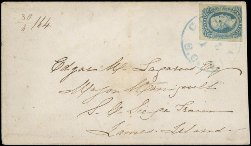 1863, 10¢ blue. Three margins, tied by blue "Columbia S.C. Jul 1" cds on cover with military address to Edgar M. Lazarius, Major Manigault, S.C. Siege Train, James Island; reduced at right. Scott No. 11; Estimate $75 - 100.