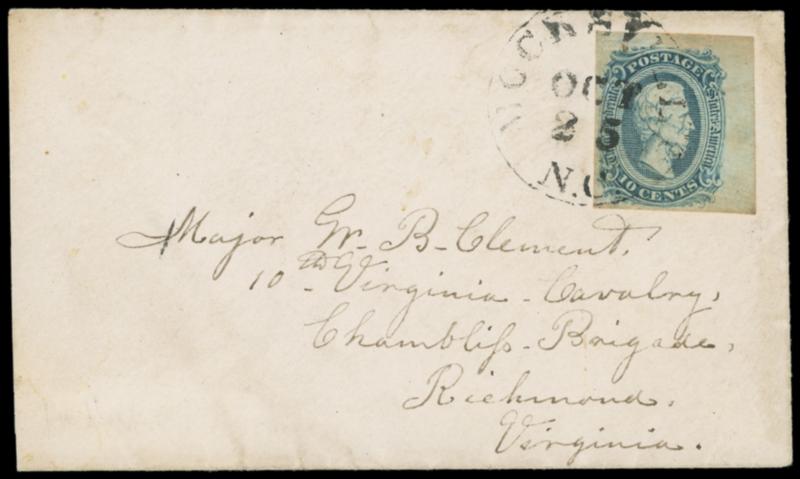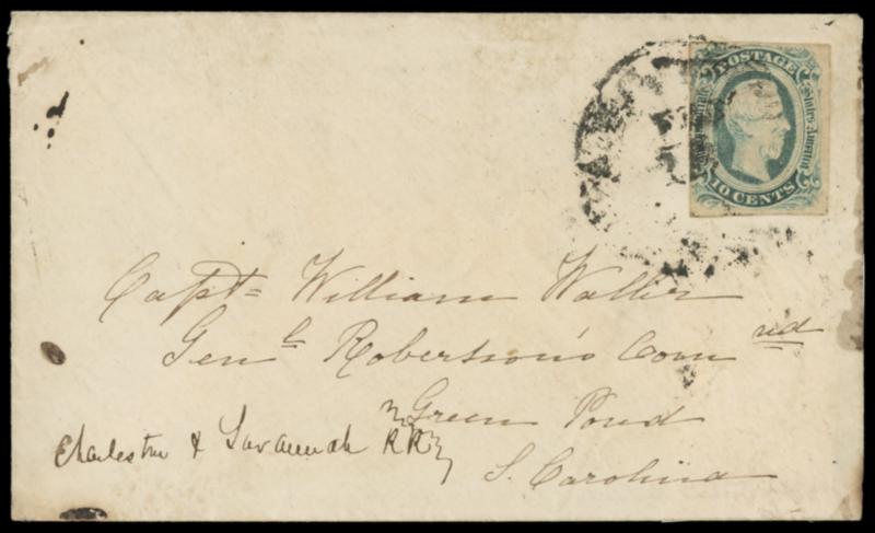 1863, 10¢ blue. Large margins to touched, tied by indstinct North Carolina cds on cover with military address to Capt. William Walker, Genl. Robertson's Com., Green Pond, S.C., endorsed "Charleston & Savannah RR" at lower left, F.-V.F. Scott No. 12; Estimate $75 - 100.