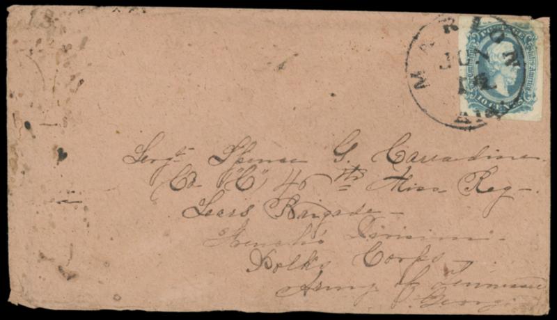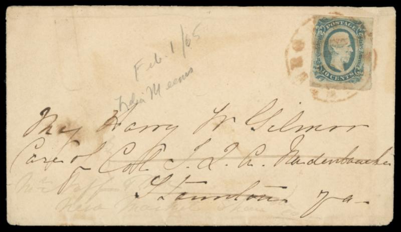1863, 10¢ blue. Four margins, tied by red-brown "Lynchburg Va. Feb 3, 1865" cds on buff cover with military address to Maj. Harry W. Gilmer, Care of Col J.Q.A. Nadenbousch, Staunton Va., updated in pencil to New Market Va., pencil "Feb. 1/65, Lydia Meenus" dating, flap with My regards to Mr. Hoffman"; edge wear, F.-V.F. Scott No. 12; $175+.
