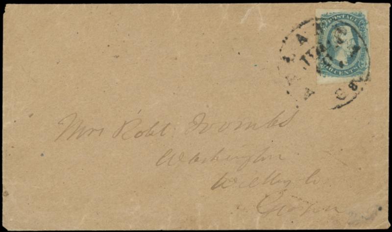 1863, 10¢ blue. Large margins tied by "Atlanta Ga., Jul 30" cds on circa 1864 homemade brown cover to the wife of General Robert Toombs at Washington Ga. in his hand, F.-V.F. Scott No. 11; Estimate $100 - 150.
