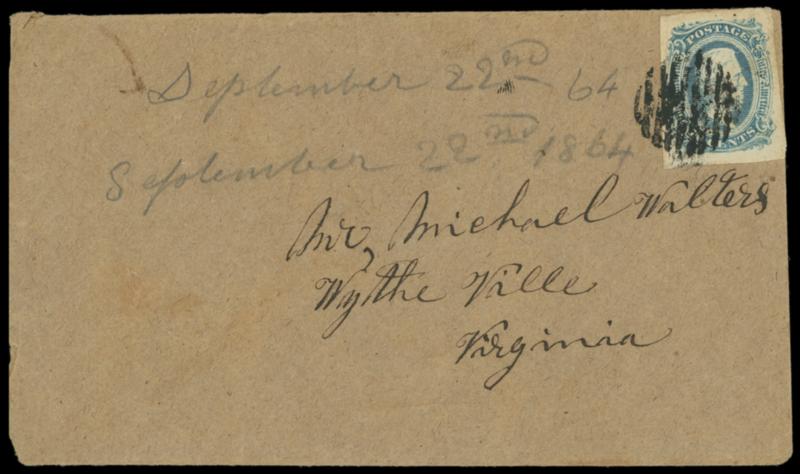1863, 10¢ blue. Large margins, tied by Army of North Va. 10-bar circular grid (ANV-10) cancel on brown cover to Wytheville Va., pencil September 22nd 1864 docketing; barely reduced at left, Very Fine. Scott No. 11; Estimate $100 - 150. US$100-150 (Image)