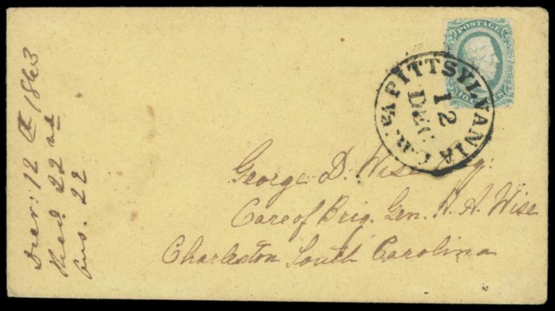 1863, 10¢ blue. Trimmed close, tied by "Pittsylvania C.H., Va. 12 Dec" cds on yellow cover with military address to George D. Wise Esq., Care of Brig. Gen. A.R. Wise, Charleston, South Carolina, 1863 docketing, Very Fine. Scott No. 11; Estimate $75 - 100.