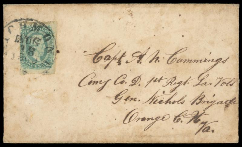 1863, 10¢ blue. Large margins to touched, tied by "Richmond Va., Aug 18, 1863" cds on cover with military address to Capt. A.N. Cummings, Comg. Co. D. 1st Regt. La. Vols, Gen. Nichols Brigade, Orange C.H., Va.; some wear and soiling, Fine, signed Brian Green. Scott No. 11; Estimate $75 - 100.