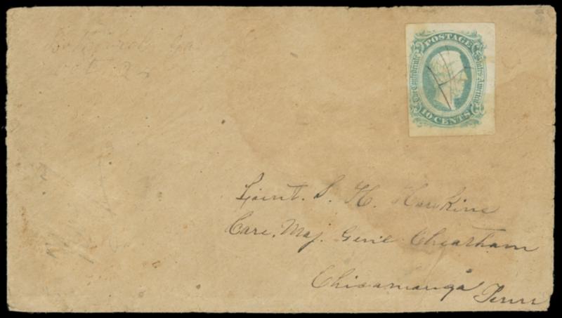 1863, 10¢ blue. Three large margins, pen cancel, matching light ms. "Bottsford, Ga. Oct 24" postmark on brown homemade cover with military address to Lieut. S.H. Hawkins, Care Maj. Gen' Cheatham, Chickamauga Tenn.; some edge wear, Fine. Scott No. 11; Estimate $75 - 100.