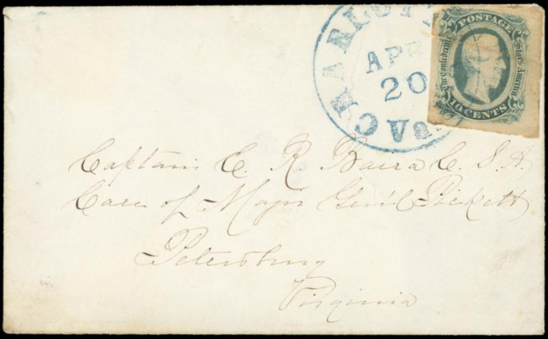 1863, 10¢ blue. Large margins except just touched at top, torn, tied by blue "Charlotte Va. Apr 22" cds on ladies cover with military address to Captain Edward R. Baird C.S.A., Major Genl. Pickett's Staff, Petersburg, Virginia, original letter datelined "York Square Seminary, New Haven" from his cousin, attractive and Fine appearance, signed Brian Green. Scott No. 11; Estimate $50 - 75.