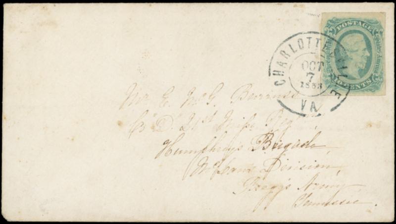 1863, 10¢ blue. Four ample to large margins, tied by neat "Charlotteville Va., Oct 7, 1863" double-circle datestamp on cover with military address to E McG. Burrus, Co. "D" 21st Miss. Reg., McLaw's Division, Bragg's Army Tennessee, fresh and Very Fine. Scott No. 12; Estimate $100 - 150.