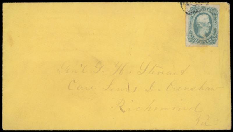 1863, 10¢ blue. Four full to large margins, tied by Army of Northern Va. four-ring target cancel (ANV-13) on yellow cover to Genl. G.H. Steuart, Care Lewis D. Crenshaw, Richmond Va., Very Fine. Scott No. 12; Estimate $100 - 150.