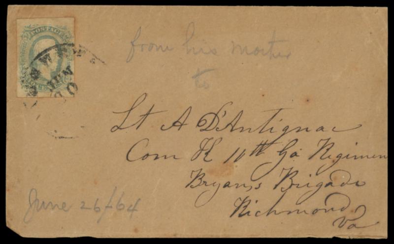 1863, 10¢ blue. Nice margins, pre-use tear, tied by indistinct cds on brown cover with military address to Lieut. A. D'Antignac, Com. K 10th Ga. Regiment, Bryan's Brigade, Richmond Va., pencil "June 26/64" docketing; toned and reduced slightly at right, Fine. Scott No. 12; Estimate $75 - 100.