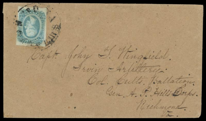 1863, 10¢ greenish blue. Beautiful large margins, tied by "Washington Ga." cds on homemade brown cover with military address to Capt. John T. Wingfield, Irvin Artillery, Col Cutts Battalion, Gen A.P. Hills Corps, Richmond Va., Very Fine, signed Brian Green. Scott No. 12c; Estimate $100 - 150.