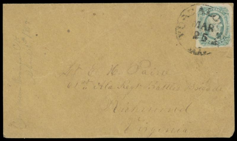 1863, 10¢ greenish blue. Four margins, horizontal crease, tied by "Tuscaloosa Ala., Mar 25" cds on homemade brown cover with military address to Lt. E.h. Paine, 61st Ala. Regt. Battles Brigade, Richmond Va., F.-V.F. Scott No. 12c; Estimate $100 - 150.