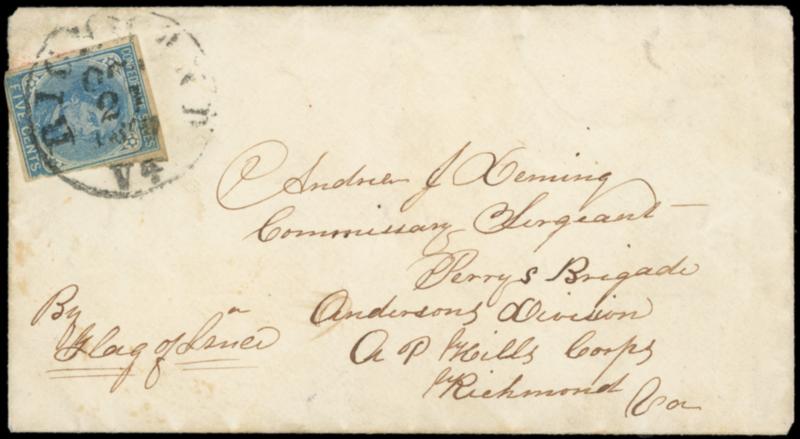 1862, 5¢ blue, Archer & Daly printing. Margins to just touched, tied by "Richmond Va., Oct 21, 1862" cds on overpaid drop cover with military address to Andrew J. Henning, Commissary Sergeant, Perry's Brigade, Anderson's Division, A.P. Hill's Corps, Richmond Va., endorsed "By Flag of Truce" at bottom left, Very Fine flag-of-truce overpaid drop use. Scott No. 7; Estimate $200 - 300.