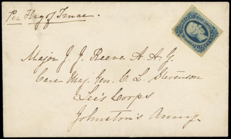 1864, 10¢ deep blue, Keatinge & Ball printing. Four margins, uncanceled, on cover from Confederate P.O.W. endorsed "Flag of Truce" with military address to Major J.J. Reeve A.A.G., Care Maj. Gen. C.L. Stevenson, Lee's Corps, Johnston's Army, possibly hand carried to Army of Tennesse, Very Fine. Scott No. 12 var.; Estimate $150 - 200.