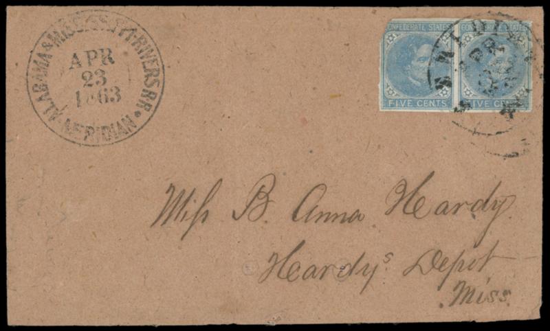 Alabama & Mississippi Rivers R.R., Meridian, Apr 23, 1863. Circular corner card datestamp on homemade brown cover bearing 5¢ blue (7) horizontal pair, four margins except trimming top left corner tied by "Meridan, Miss. Apr 23, 1863" cds to Hardy's Depot, Mississippi, a Very Fine and rare strike of the Meridian station marking, with 1994 P.F. certificate. Estimate; $750 - 1,000.