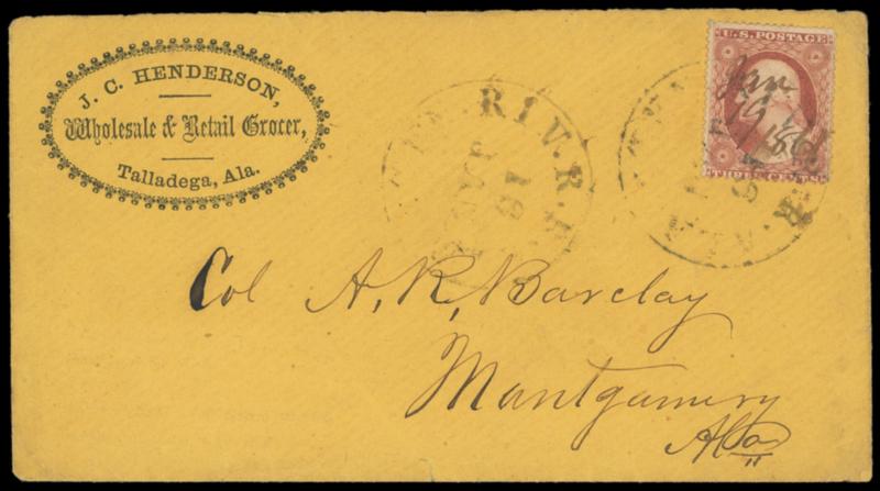 (Alabama & Tennessee River Railroad) ALA. & TEN. RIV. R. R., 16 Jan. Route agent cds ties U.S. 3¢ dull red (26), additional strike adjacent on orange cover with "J.C. Henderson, Wholesale & Retail Grocer, Talladega, Ala." corner card to Montgomery, Ala., stamp with ms. "Jan 19, 1861" docketing; some edge wear, Very Fine Independent state railroad use. C.S.A. Catalog; $1,500.