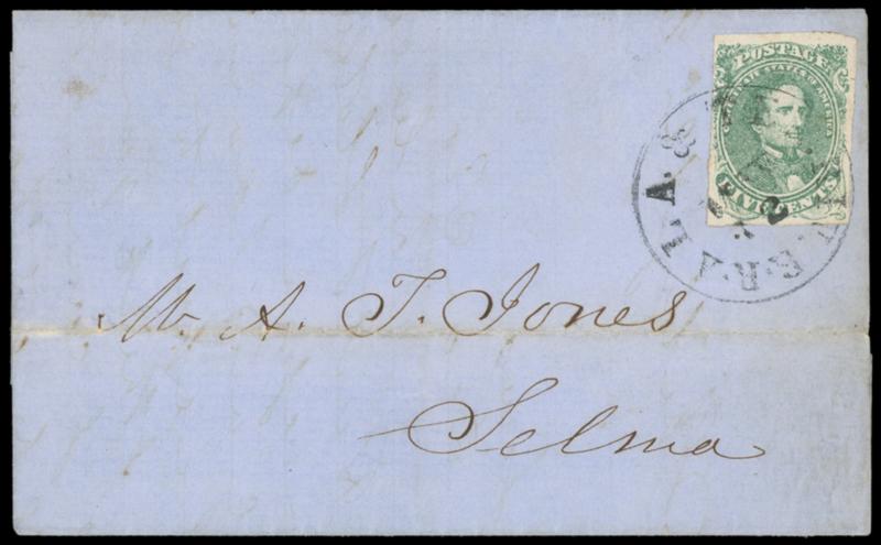 (Alabama & Tennessee River Railroad) ALA. & TEN. RIV. R. R., May 12. Neat strike of route agent cds ties 5¢ green (1), four margins, on blue folded letter datelined "Shelby, 12 May 1862" to Selma Ala.; horizontal file fold, a Very Fine strike. C.S.A. Catalog; $1,500.