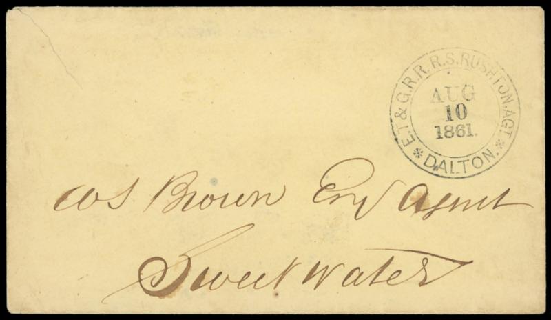 (East Tennessee & Georgia Railroad) E.T & G. R.R., R.S. Rushton, Agt. * Dalton * Aug 10, 1861. Bold station agent double-circle datestamp on yellow cover to Railroad Agent in Sweetwater, Tenn. sent free on company business between agents; top left cover tear, otherwise Very Fine and rare Confederate Georgia railroad use, a lovely example of this seldom seen marking. C.S.A. Catalog; $1,000.