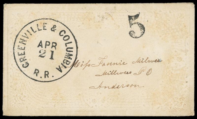 Greenville & Columbia R.R. Apr 21. Perfect strike of route agent cds with "5" rating handstamp on small lady's embossed cover to Anderson S.C.; just a hint of toning, Very Fine. Estimate; $300 - 400.