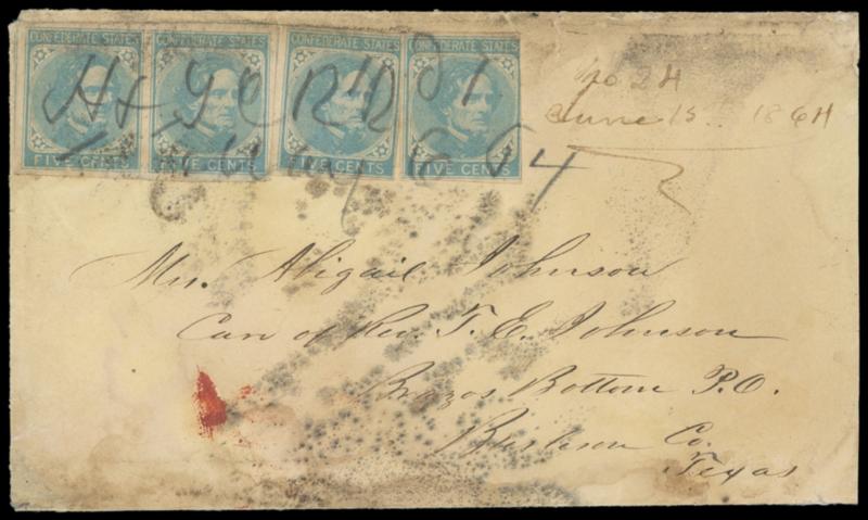 THE ONLY RECORDED COVER POSTMARKED BY A CONFEDERATE TEXAS ROUTE AGENT.