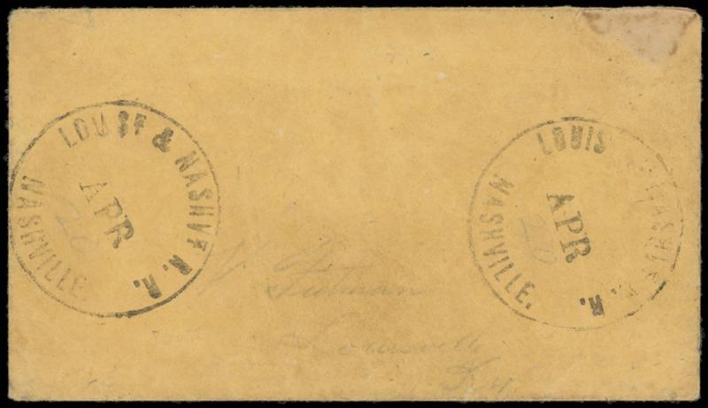 Lousa. & Nashve. R.R., Nashville. Apr "20". Two strikes of route agent on front and one as flap seal of orange buff cover with light pencil address to Louisville Ky.; light stain at top right, Very Fine and rare,Rarity X, ex-Knapp, Towle, Weyer. Towle No. 525-S-1; Estimate $500 - 750.