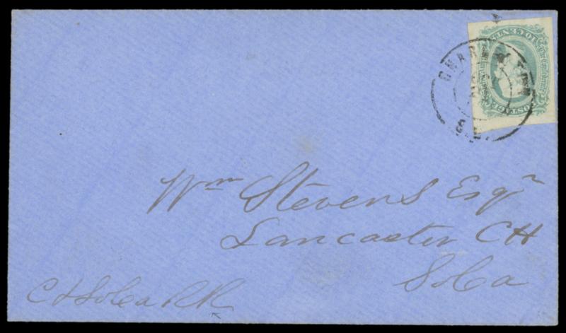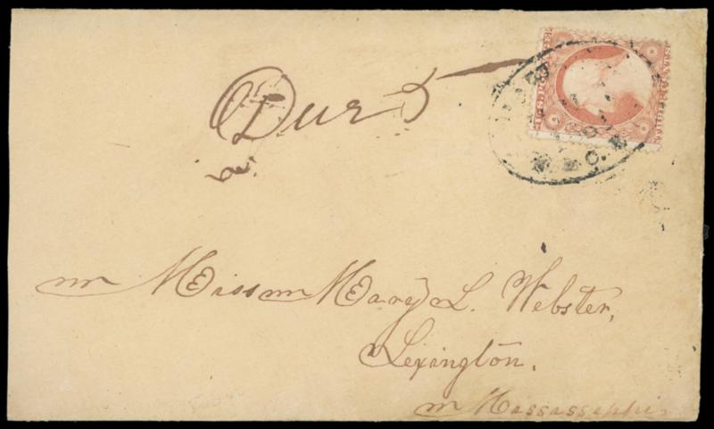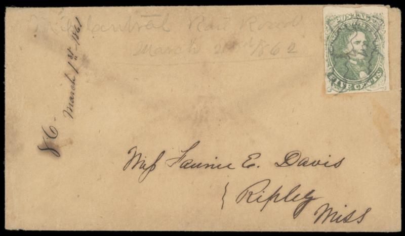 "Miss Central Rail Road, March 2nd 1862". Pencil manuscript postmark with matching pencil cancel tying 5¢ green, stone 2 (1), large margins, on buff cover to Ripley Miss., notation "86 - March 1st -1861" concerning contents at left, Fine and rare. Estimate; $500 - 750.