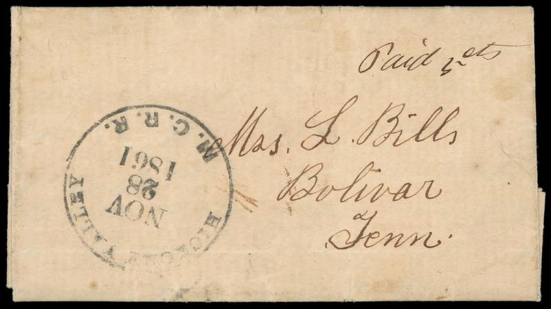 (Mississippi Central Railroad) Hickory Valley, M.C.R.R., Nov 28, 1861. Station agent cds with ms. "Paid 5 Cts" rating on folded letter to Bolivar, Tenn.; light folds, Very Fine and rare, with 1987 C.S.A. certificate. C.S.A. Catalog; $1,500. US$0 (Image)