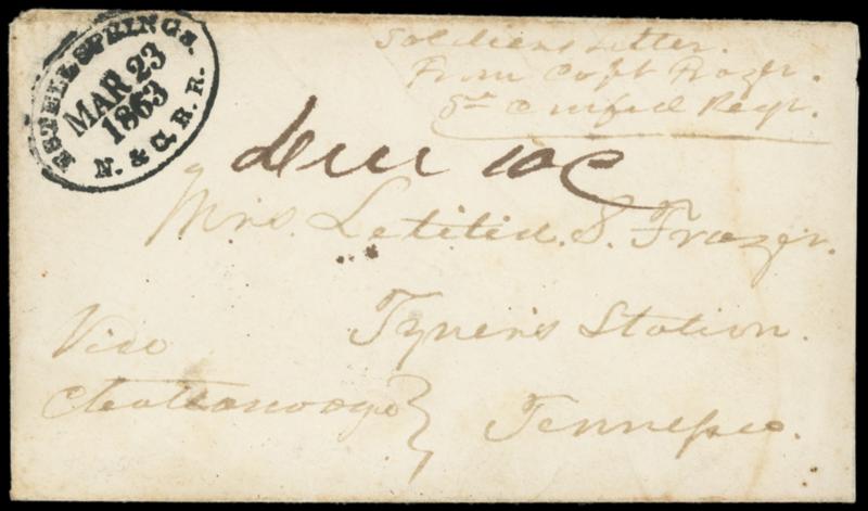 (Nashville & Chattanooga Railroad) Estell Springs, N. & C. R. R., Mar 23, 1863. Intense bold station oval with manuscript "Due 10c" rating on "Soldiers Letter" endorsed cover to Tyner's Station, Tennessee, endorsed "Via Chattanooga" at lower right, Very Fine and choice strike. C.S.A. Catalog; $1,500.