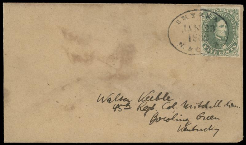 (Nashville & Chattanooga Railroad) Smyrna, N. & C. R.R., Jan 23, 1862. Station agent oval ties 5¢ olive green, stone A-B (1), four margins, on buff cover to Bowling Green, Kentucky with military address to Walter Keeble, 45th Regt, Col. Mitchell Com.; minor light foxing, reduced slightly at left, otherwise Very Fine,ex-Conrad Bush. Towle No. 520-S-2. C.S.A. Catalog; $1,500.