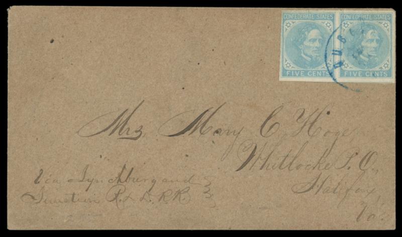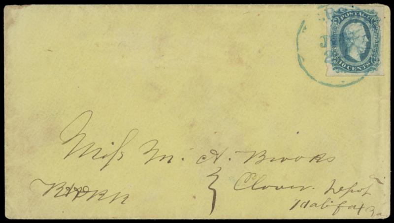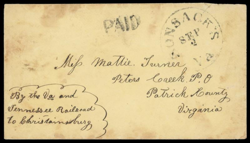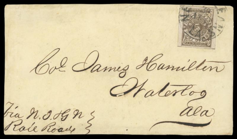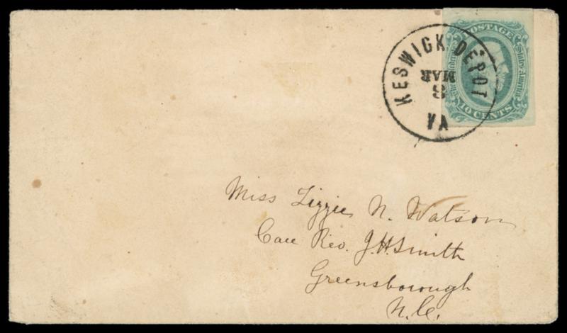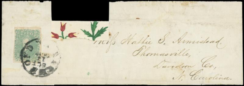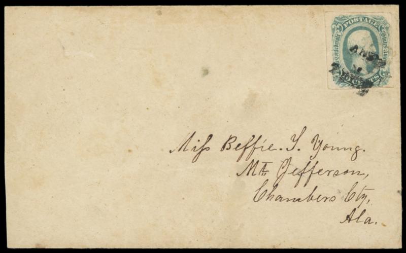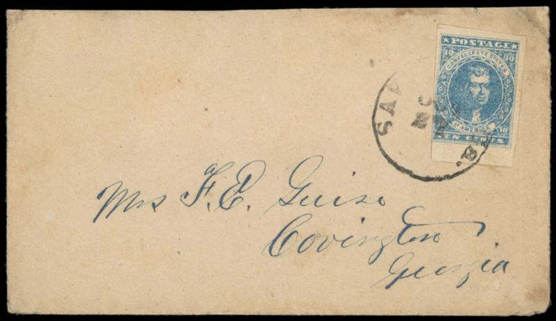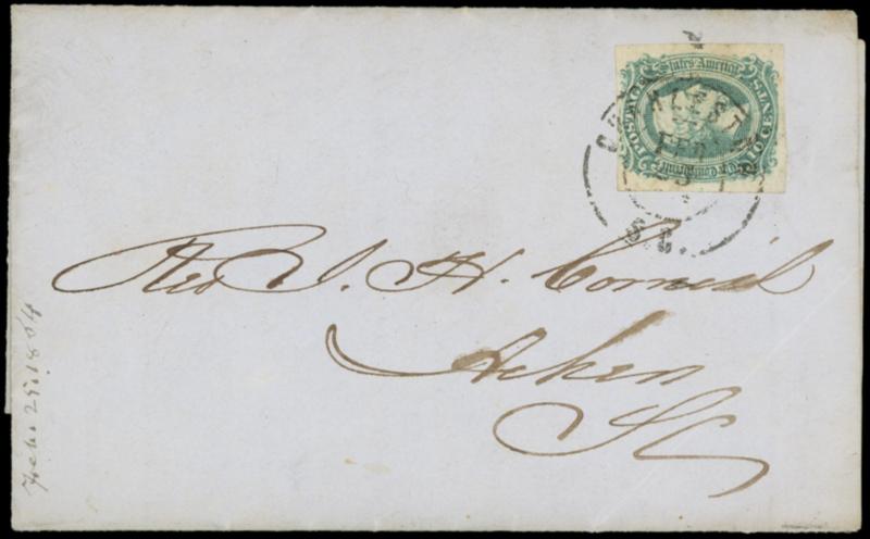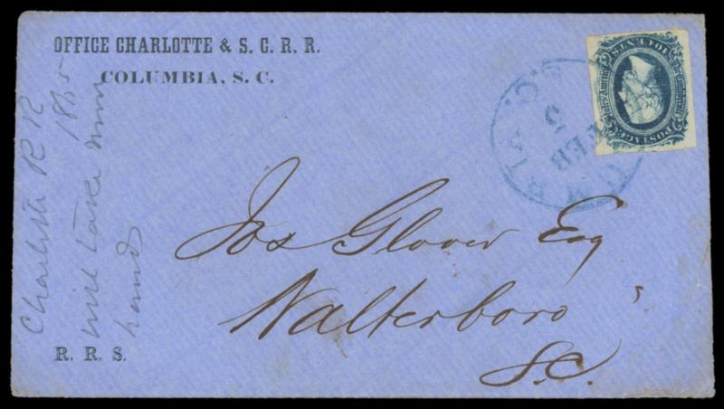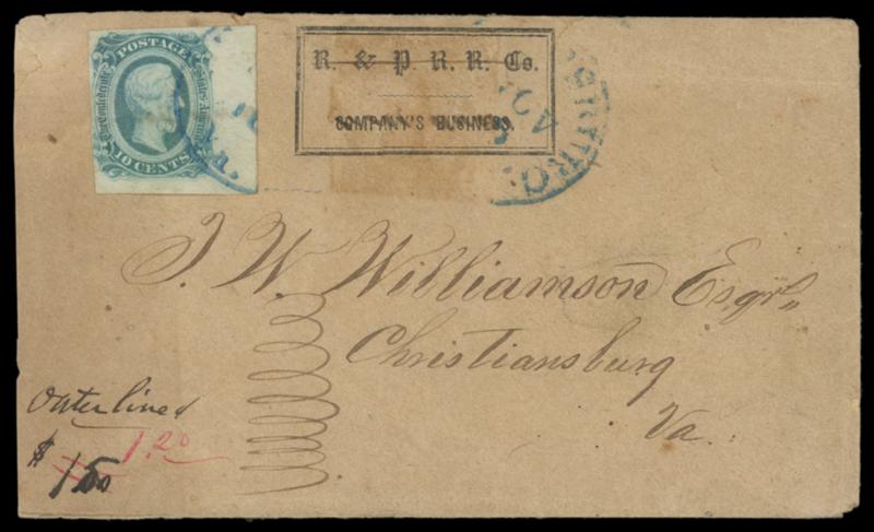 This railroad did not have significant operations before 1851 when the 3¢ rate was adopted. Therefore this is a Confederate use. This was the listing example in the 1986 Dietz catalog, but is not listed in the current CSA catalog. US$300-400 (Image)