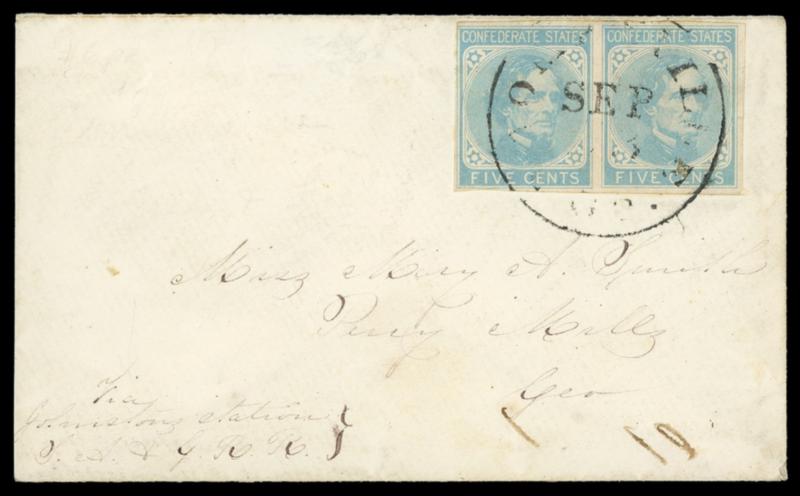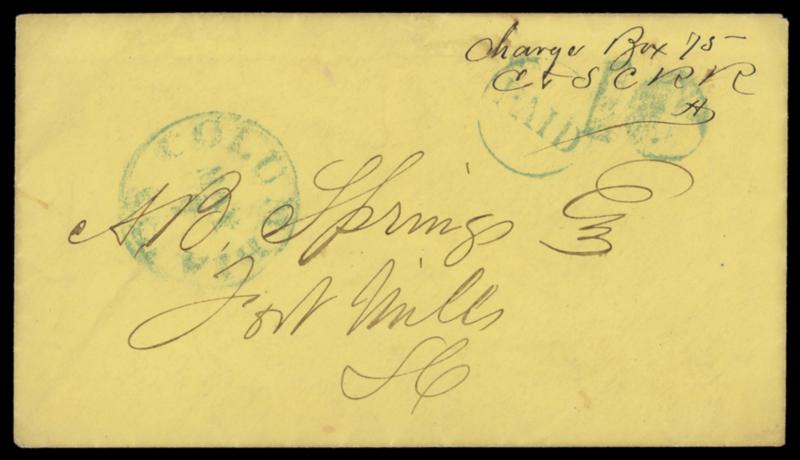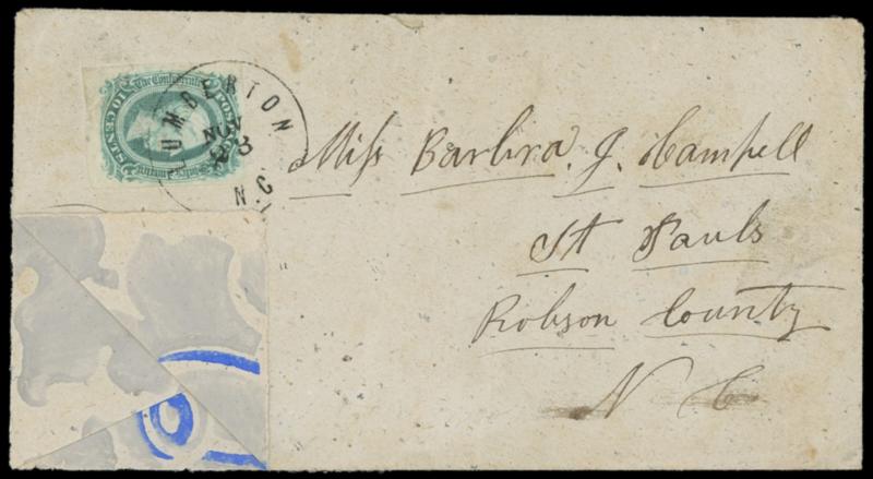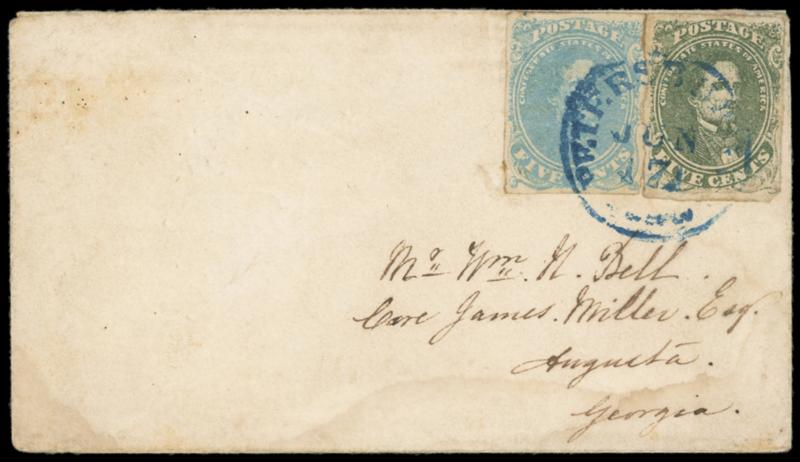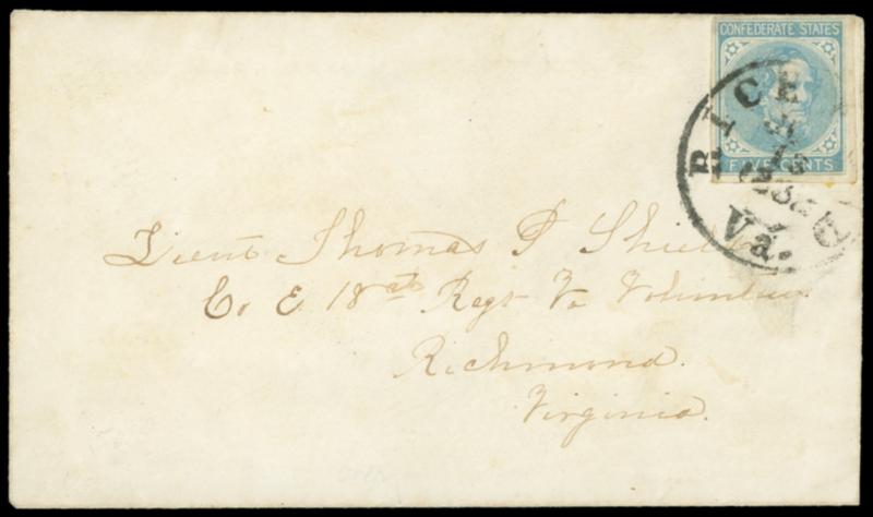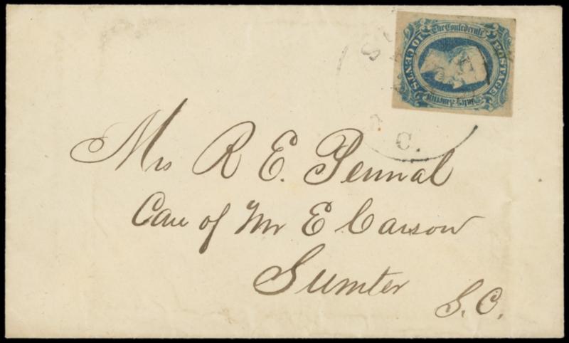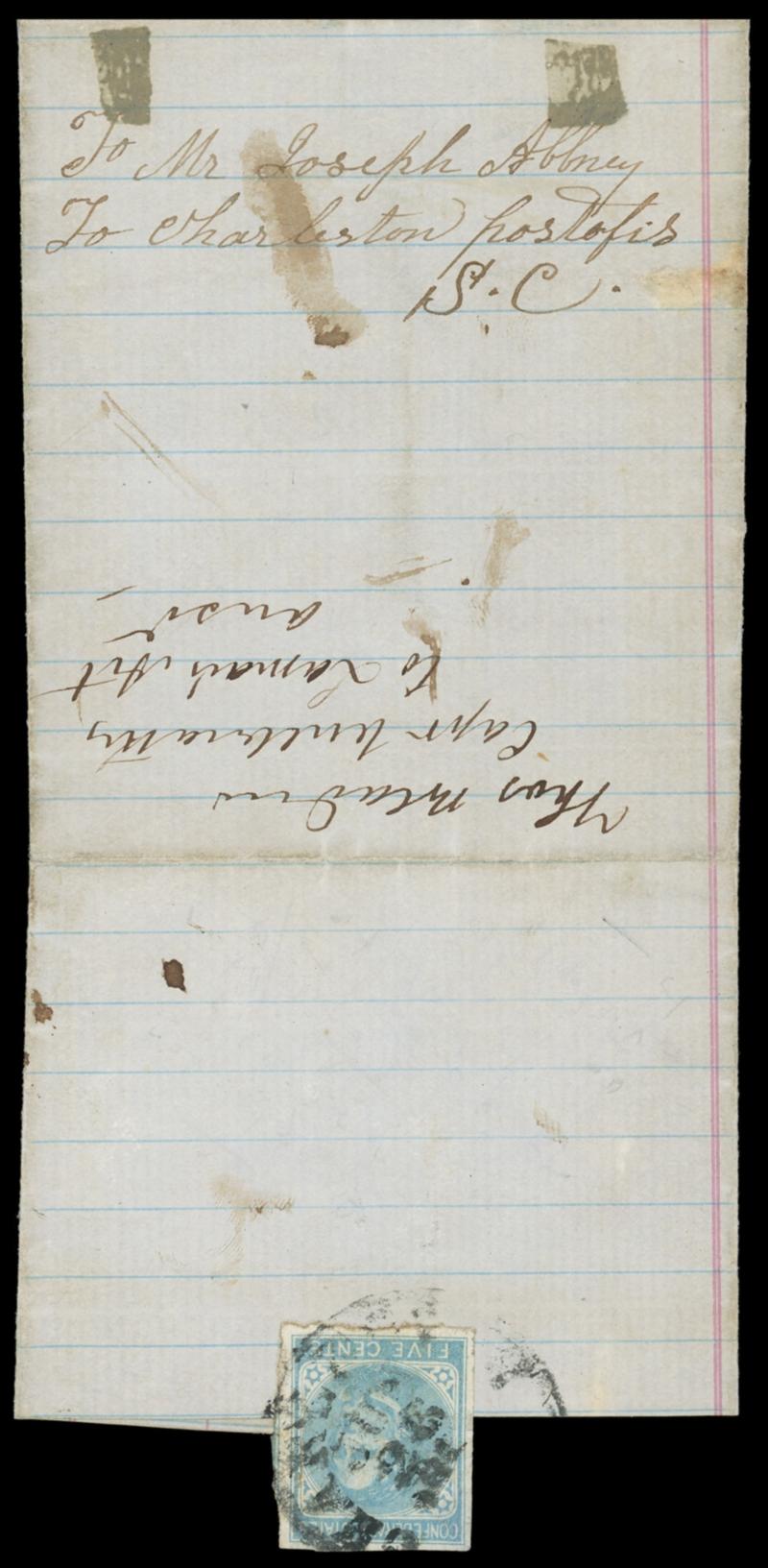 The sender was in the South Carolina State Militia and CSA postal rules did not permit state militia soldiers to send mail collect. The 5¢ stamp overpaid the 2¢ drop letter fee. US$300-400 (Image)