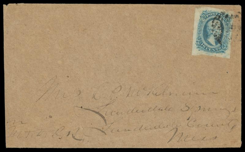 1863, 10¢ blue. Large to huge margins, tied by neat "Lumberton N.C. Nov 23" cds on gray and blue wallpaper cover to St. Pauls, N.C., Very Fine and beautiful wallpaper cover,ex-Everett. Scott No. 11; Estimate $750 - 1,000. US$750-1,000 (Image)
