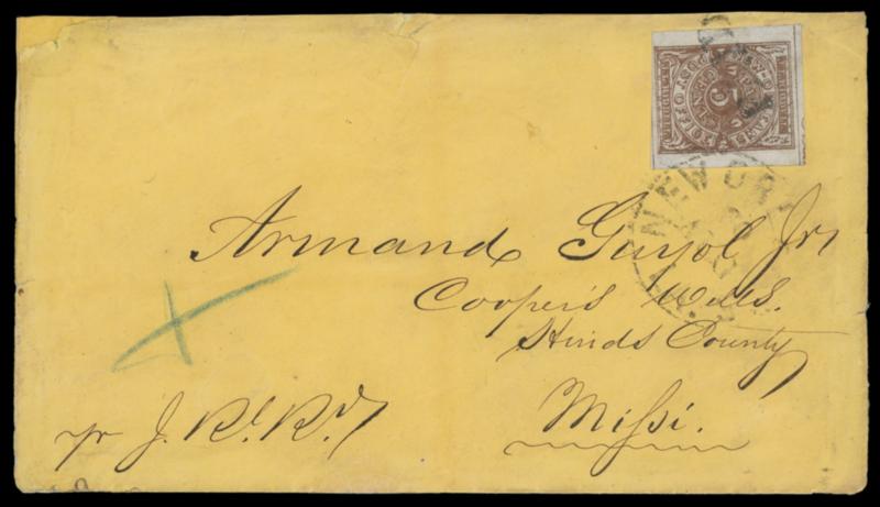 This cover was postmarked along the railroad route and deposited in the mail bag at Millican Tx. at the end of the line for delivery a few miles north to Brazos Bottom P.O. The Houston & Texas R.R. began operations in 1856, taking over the Galveston & Red River (chartered in 1848, with construction beginning in 1853). 80 miles of main track were completed from Houston to Millican's with an additional 10 miles graded and ready for the superstructure in early 1861. US$1,500-2,000 (Image)