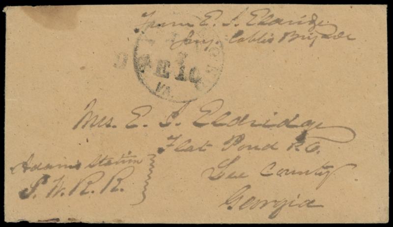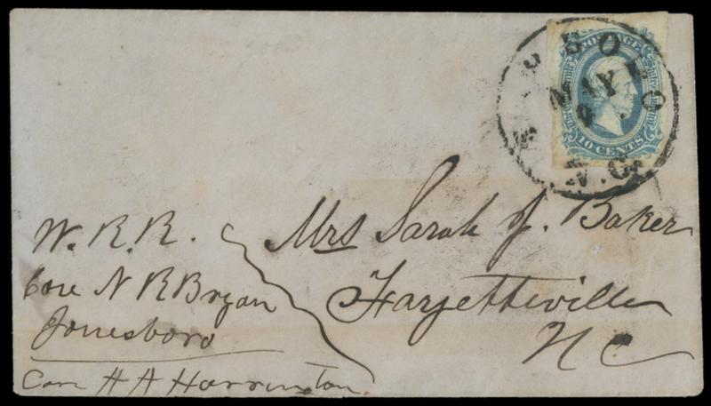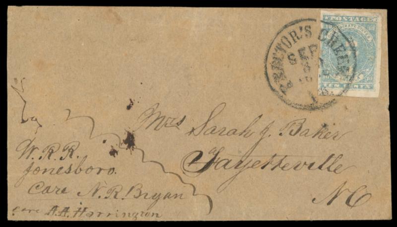 Western Railroad. Gray cover bearing 10¢ blue (11), four margins, tied by "Tarboro N.C. Sep 27" cds to Fayetteville N.C. with "W.R.R. Jonesboro, care N.R. Bryan" railroad endorsement at lower left; partial bottom flap, Very Fine. Estimate; $150 - 200.