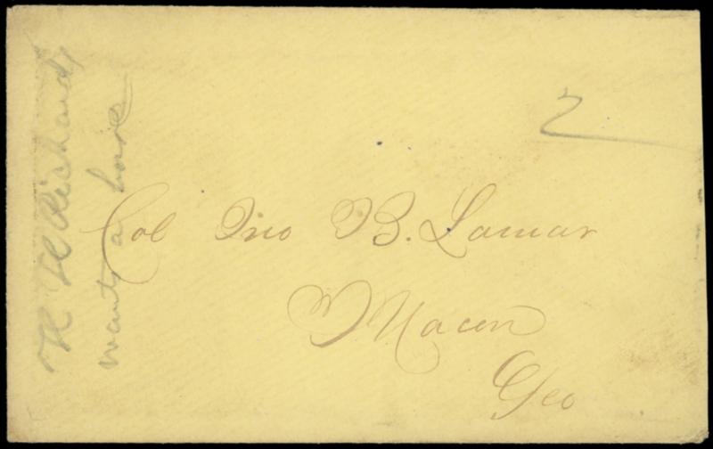 Macon, Ga "2". Pencil 2¢ drop rating on yellow cover addressed to Col. J.B. Lamar, docketed from H.H. Richard; reduced at right, Very Fine and unlisted 2¢ drop rating use, signed Kimbrough. Estimate; $150 - 200. US$150-200 (Image)