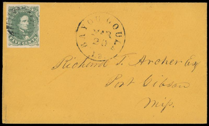 1861, 5¢ green. Large even margins, sharp impression on birght paper, canceled by circular grid, matching "Bayou Goula, La. Mar 20" cds on orange cover to Port gibson Miss.; flap torn, Very Fine,ex-Hall. Scott No. 1; $300. US$0 (Image)