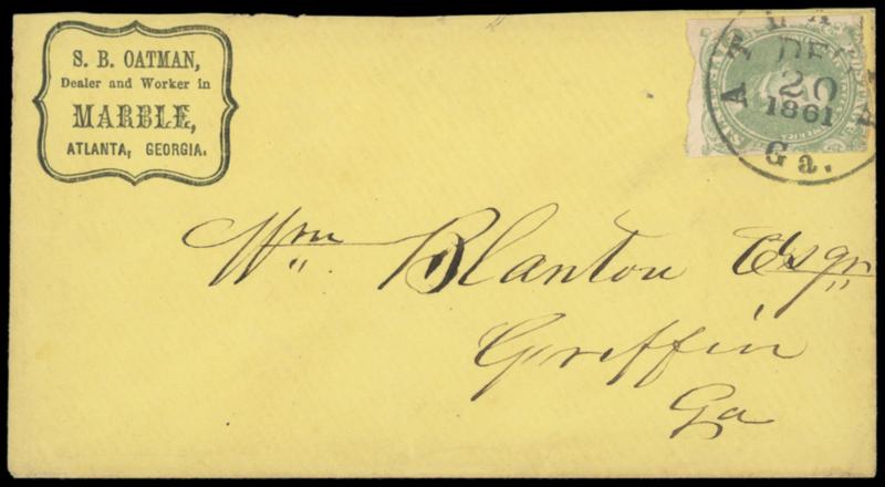 1861, 5¢ green. Bright shade, margins to in, tied by "Atlanta Ga. Dec 20, 1861" cds on yellow cover with "S.B. Oatman, Dealer and Worker in Marble, Atlanta, Georgia" shield framed corner card to Griffin Ga.; reduced at top and no flap, F.-V.F. Scott No. 1; Estimate $150 - 200. US$150-200 (Image)