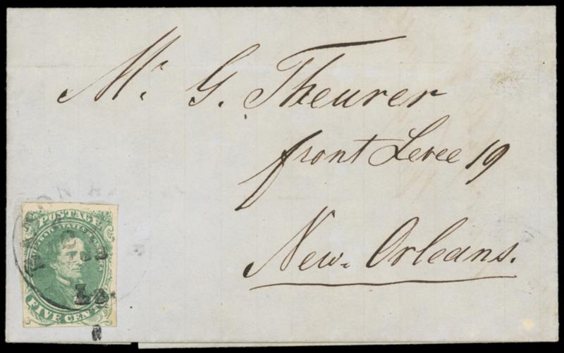 1861, 5¢ green. Four clear to large margins, tied by partial "Baton Rouge La., Jan 27, 1863" cds on gray folded letter to New Orleans La., Very Fine. Scott No. 1; $300. US$0 (Image)