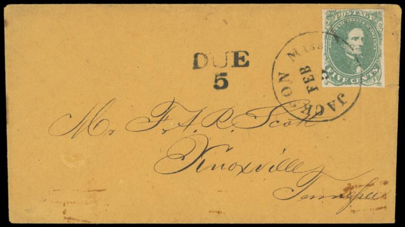 1861, 5¢ green. Four ample to full margins, tied by "Jackson Miss., Feb 5" cds on orange cover to Knoxville Tenn., bold "Due 5" handstamp; small edge tear and couple light rust marks, F.-V.F. Scott No. 1; $300. US$0 (Image)
