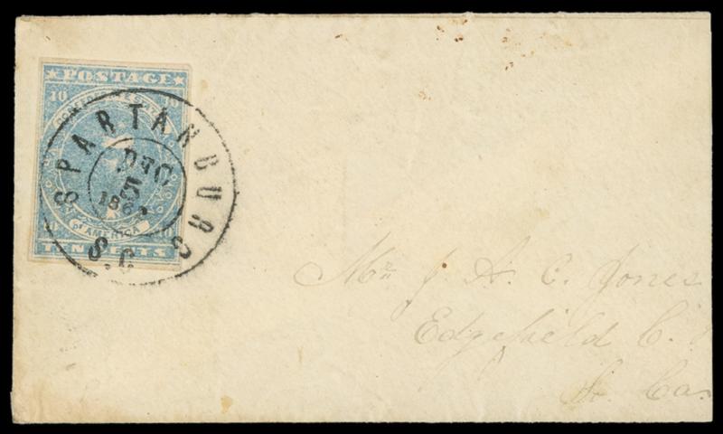 1861, 10¢ blue, Patterson printing. Four margins, tied by sharp "Spartainburg S.C., Dec 5, 1862" cds on small ladies cover to Edgefield S.C.; reduced slightly at right, Very Fine. Scott No. 2; $325. US$0 (Image)