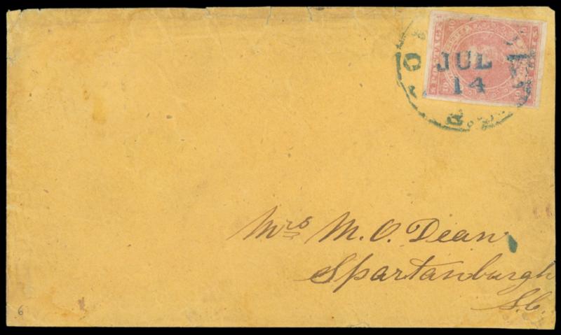 1862, 10¢ rose. Full even margins, tiny tear at top, tied by blue ""Columbia S.C. Jul 14" cds on 1862 orange cover to Spartanburg S.C.; minor edge wrinkles and tears, slightly reduced, Fine and attractive, signed Ashbrook. Scott No. 5; $750. US$0 (Image)