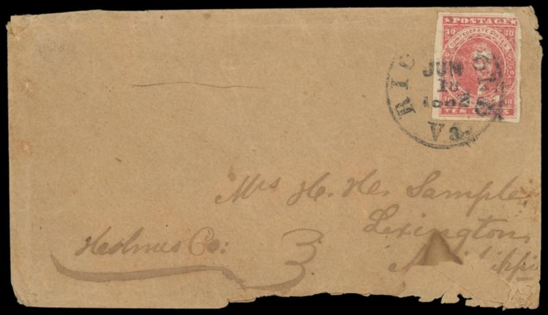 1862, 10¢ carmine. Deep shade, margins all around except at top right where rounded and touching frameline, tied by "Richmond Va. Jun 18, 1862" cds on brown cover to Lexington Miss., otherwise Fine and rare, with 1984 P.F. certificate. Scott No. 5a; $5,000. US$0 (Image)
