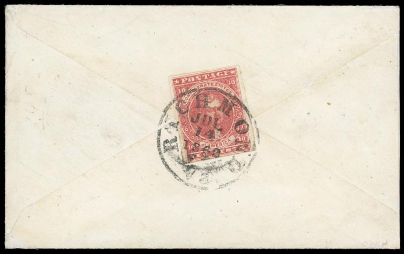 1862, 10¢ carmine. Four clear to large margins, tied by "Richmond, Va. Jul 14, 1862" cds on back of cover to South Carolina; gently cleaned, reduced slightly at left, Very Fine and scarce shade on cover,ex-Finney, Hill Jr. Scott No. 5a; $5,000. US$0 (Image)