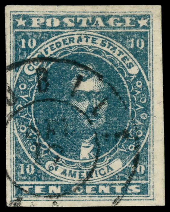 1861, 10¢ blue, Paterson printing (Scott 2), 'MOBILE' cds, Very Fine. Scott $180. (Image)