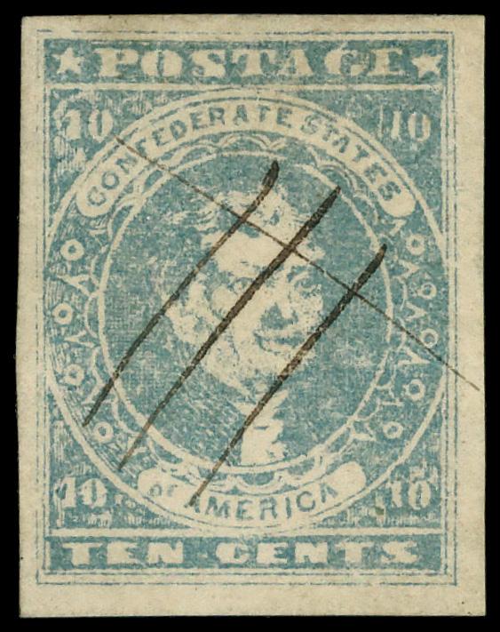 1863, 10¢ blue, "T-E-N" (Scott 9), pen cancel, Very Fine. Scott $300. (Image)