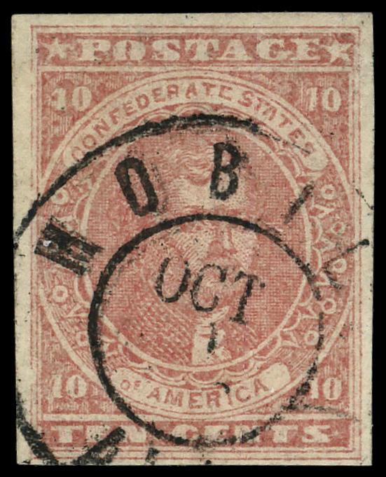 1862, 10¢ rose (Scott 5), 'MOBILE' cds, Very Fine. Scott $400. (Image)
