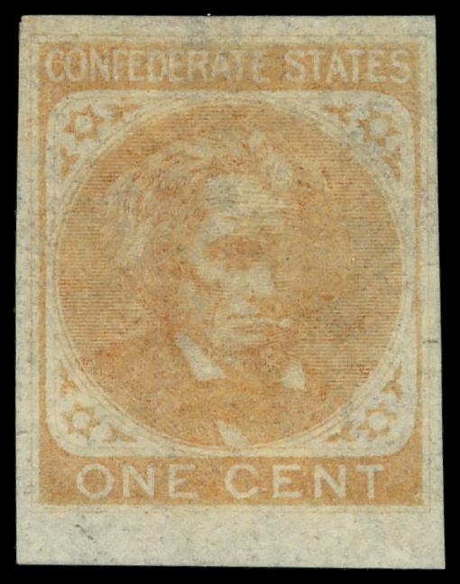 1862, 1¢ orange, unissued (Scott 14), unused without gum, Very Fine. Scott $60. (Image)