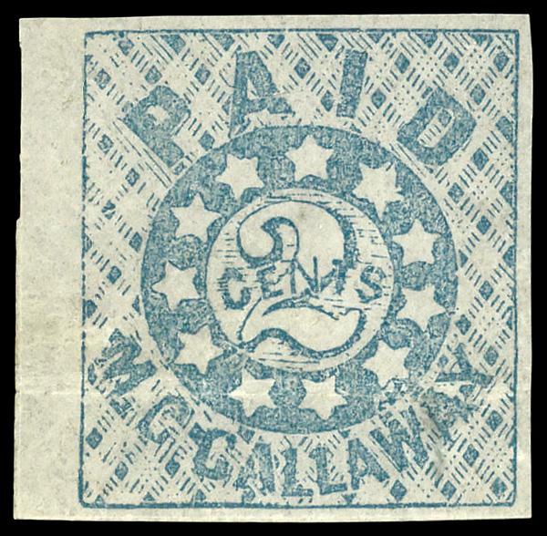 Memphis, Tenn., 1861, 2¢ blue (Scott 56X1), left margin single, unused without gum; creases, Very Fine. Scott $100. (Image)