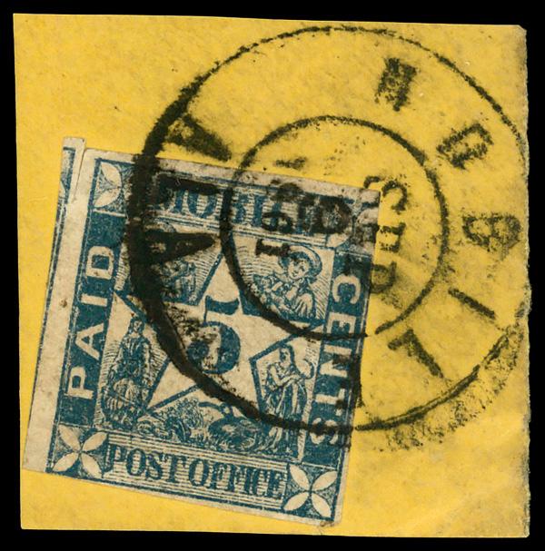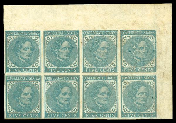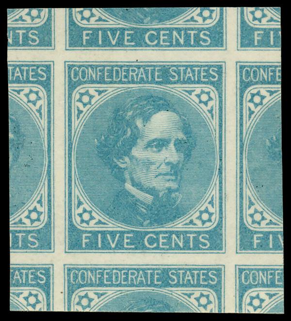 1862, 5¢ light blue, De La Rue printing (Scott 6), massive stamp with portions of adjoining stamps all around, o.g., never hinged; very light bend at top, Superb. Scott $20. (Image)