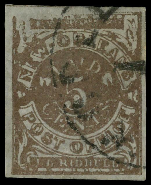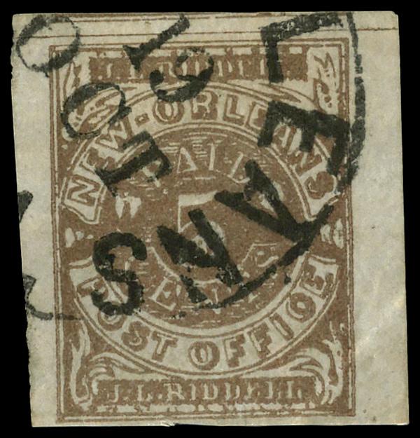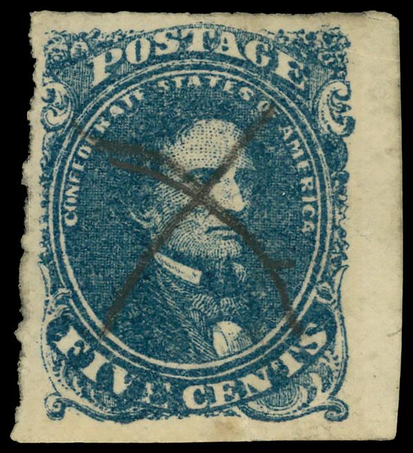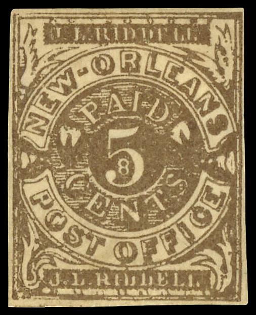New Orleans, La., 1861, 5¢ brown (Scott 62X3), four full margins with large margins at top, left and right; corner crease at bottom right, Very Fine to Extremely Fine. Scott $275. (Image)