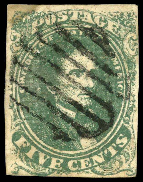1861, 5¢ green (Scott 1), black grid cancel; toning and sealed tear, Fine. Scott $175. (Image)